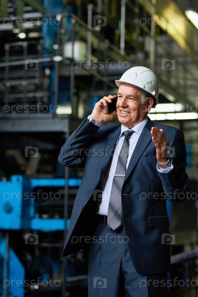 Старший бизнесмен разговаривает по телефону в фабричной мастерской