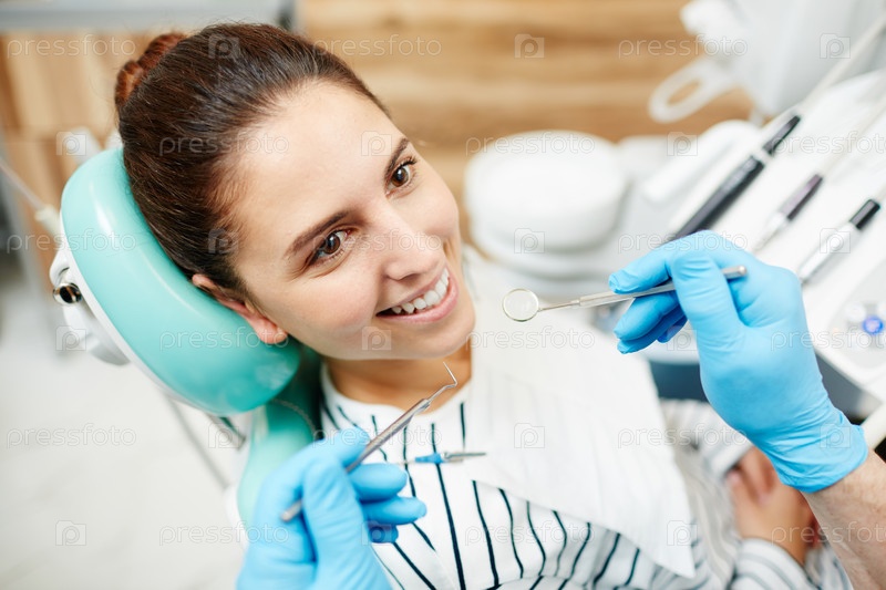 Позитивная молодая женщина, посещающая стоматолога