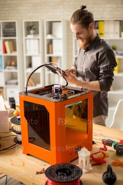 Веселый дизайнер, работающий с 3D принтером