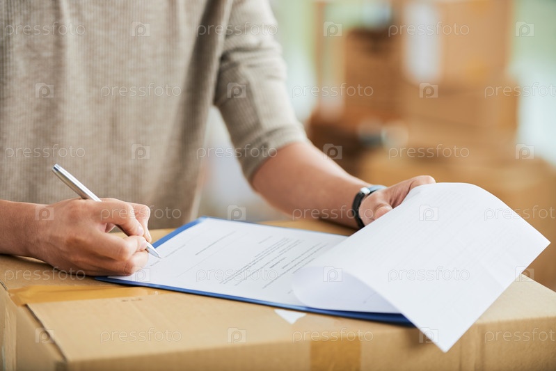 Мужчина подписывает документ на картонном ящике
