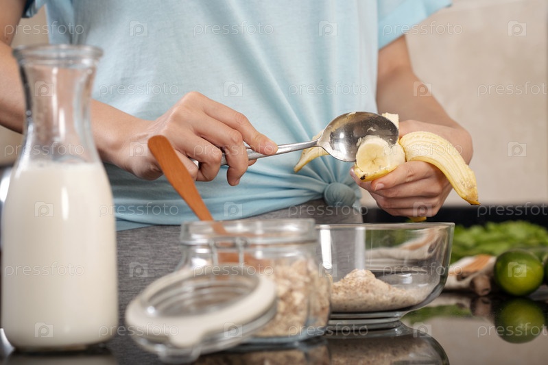 Adding banana in muesli Добавление бананов в мюсли