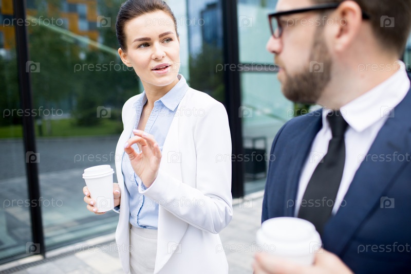 Бизнесмены с бумажными чашками, ходящие и разговаривающие