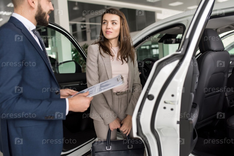Красивая женщина, выбирающая новый автомобиль