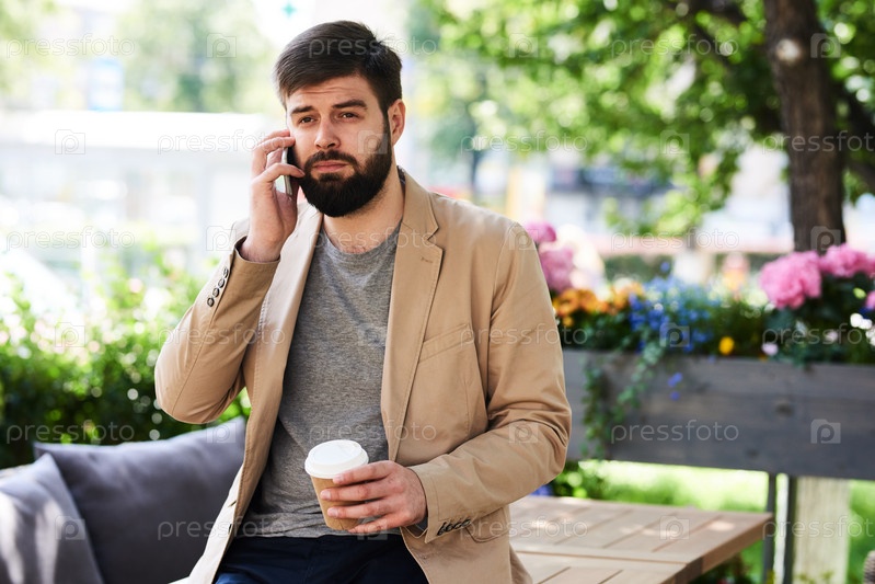Современный человек разговаривает по телефону в кафе на открытом воздухе