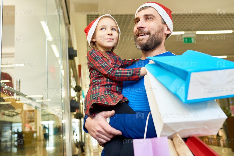 Мужчина и девушка в Санта-Клаусе ходят по магазинам вместе