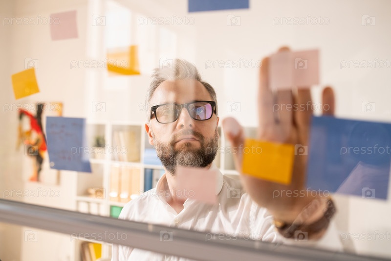 Интроспективный бизнесмен присоединяет наклейки к стеклу