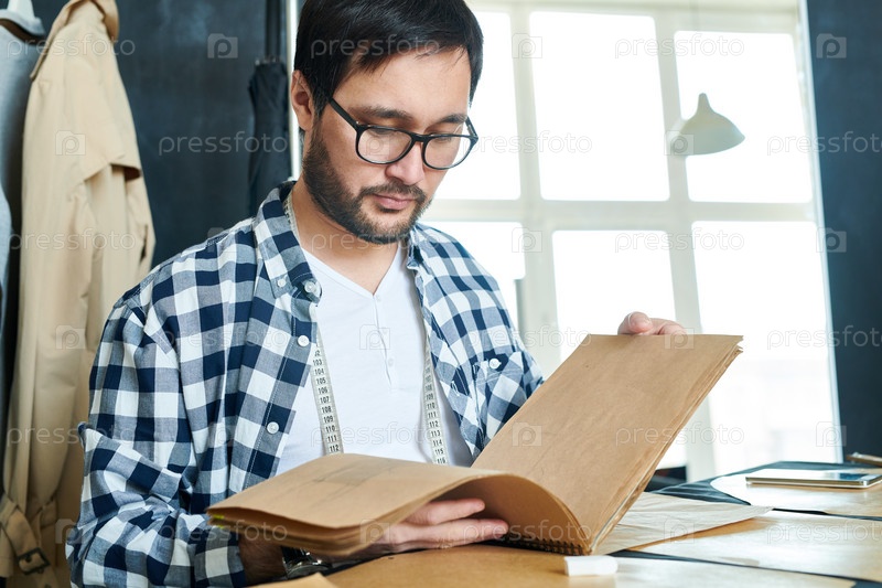 Мужчина смотрит на эскизную книжку с моделями одежды