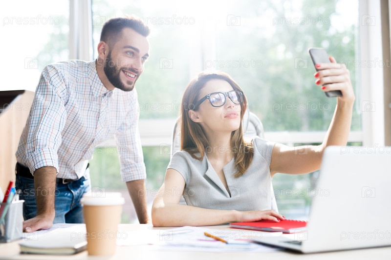 Молодая бизнесвуменка делает селфи с коллегой