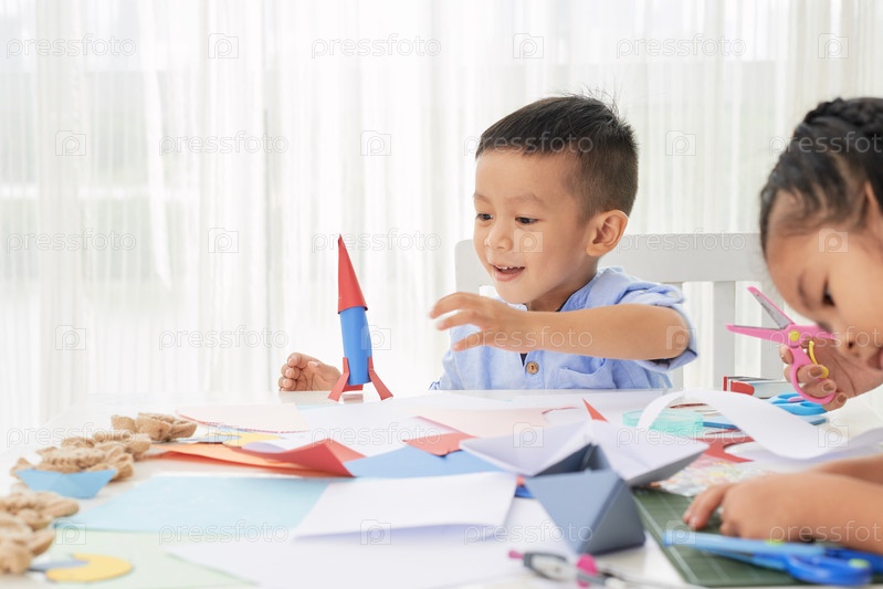Милый мальчик с бумажной ракетой