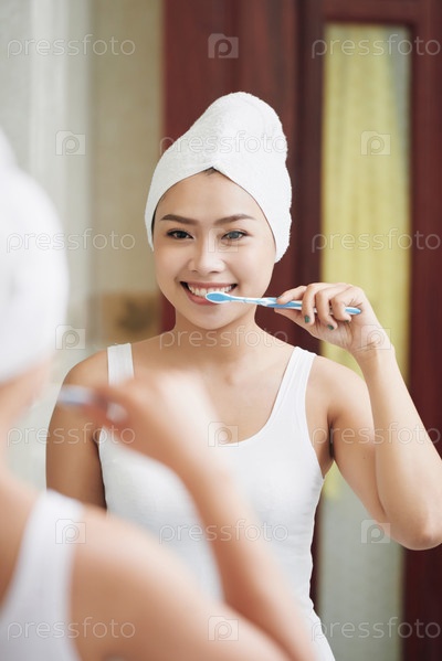 Женщина чистит зубы при отражении в зеркале