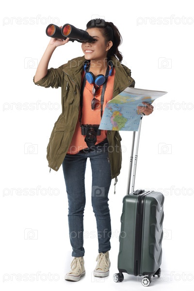 Красивый путешественник, глядящий сквозь бинокль