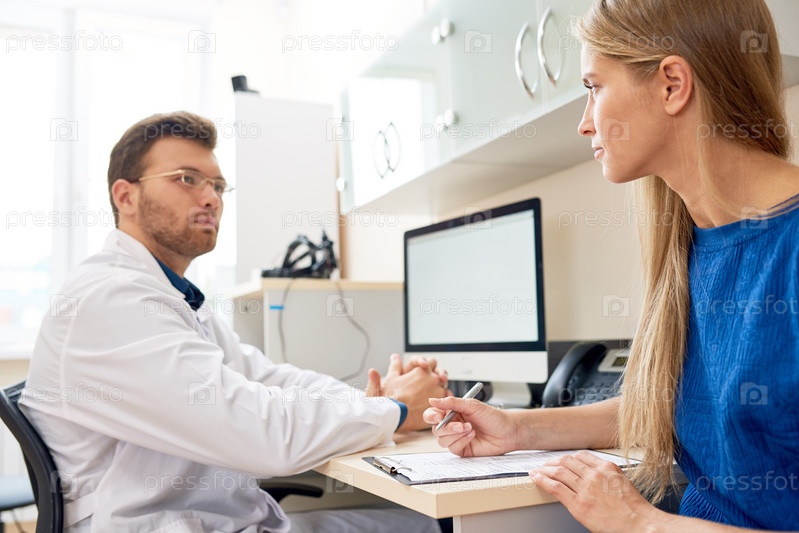 Молодая женщина разговаривает с доктором