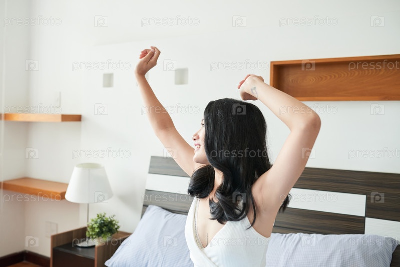 Счастливая женщина просыпается в постели дома