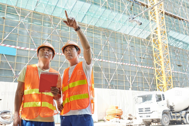 Инженеры обсуждают работу на свежем воздухе