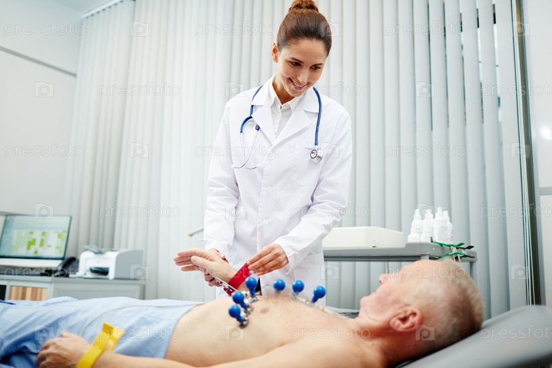 Улыбающийся кардиолог готовит пациента к процедуре