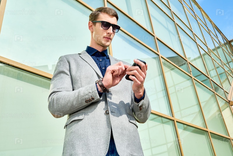 Молодой бизнесмен использует смартфон на открытом воздухе