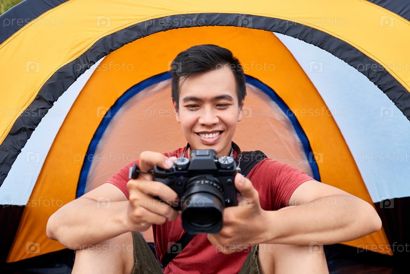Улыбающийся фотограф проверяет фотографии