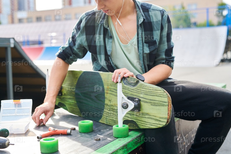 Молодой человек исправляет скейтборд