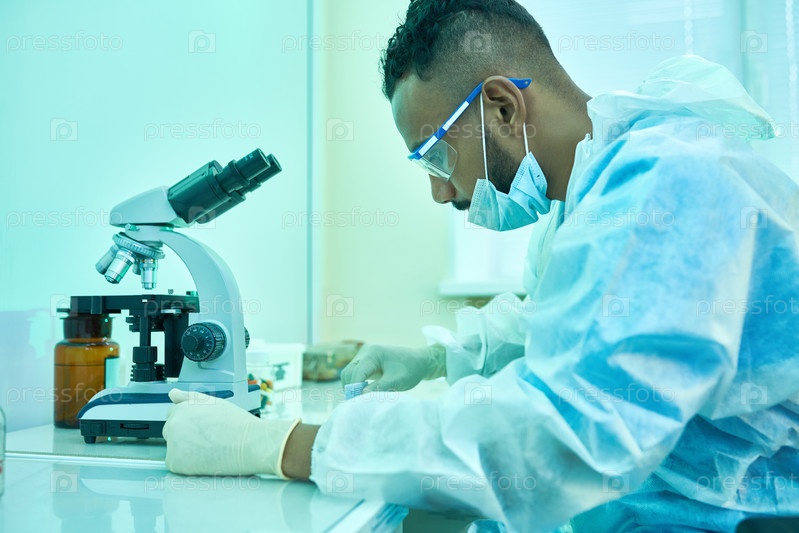 Удивленный ученый-исследователь, работающий в лаборатории