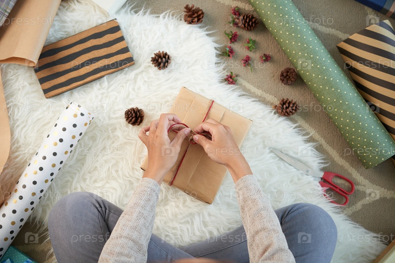 Женщина украшает подарки