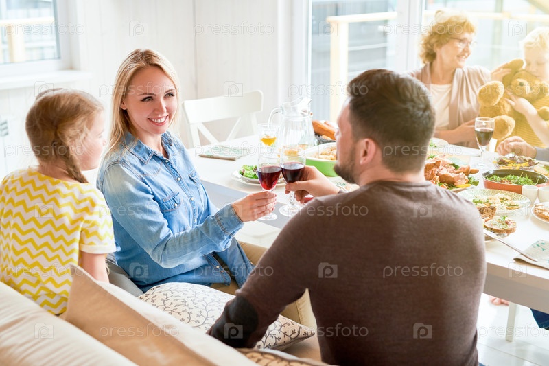 Счастливая пара стучит очками на семейном ужине