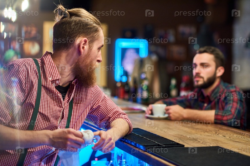 Бармен разговаривает с гостем на стойке