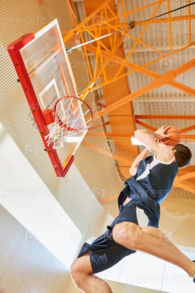 Спортсмен прыгает и бросает мяч в сетку
