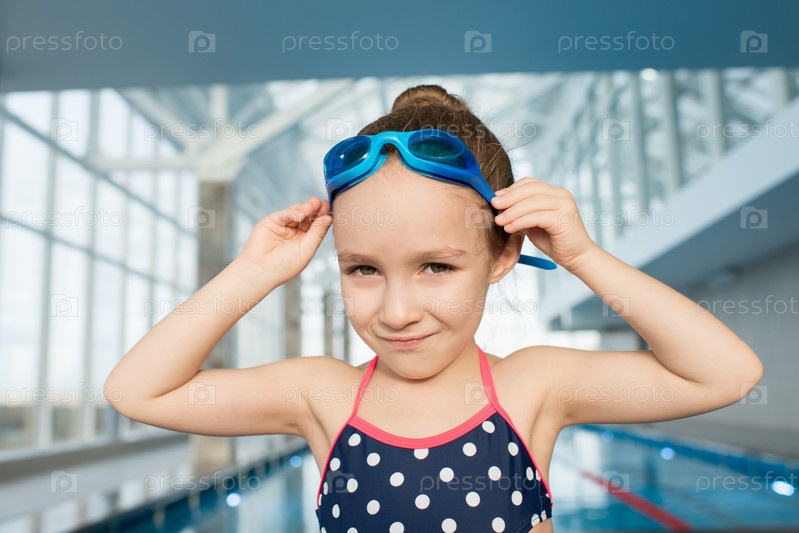 Маленькая пловчиха позирует для фотографии