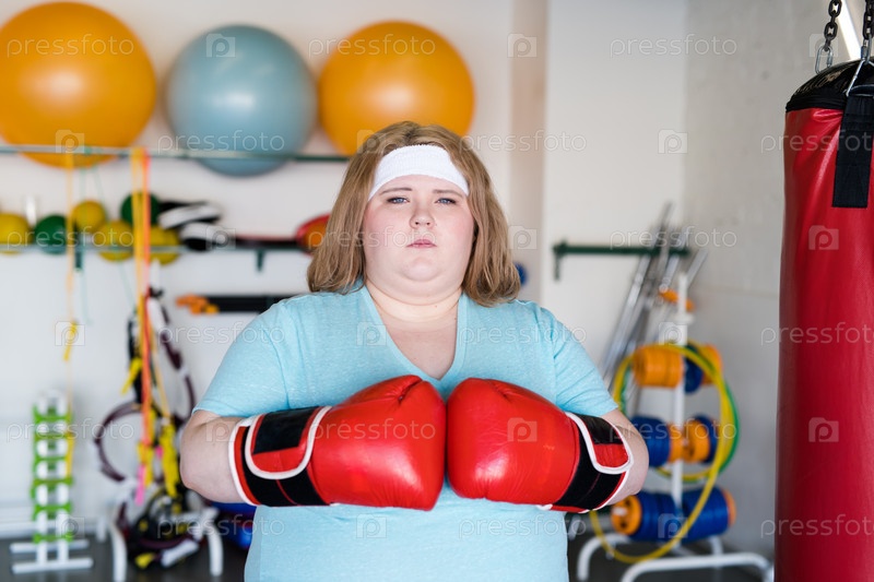 Женщина с избыточным весом боксирует в спортзале