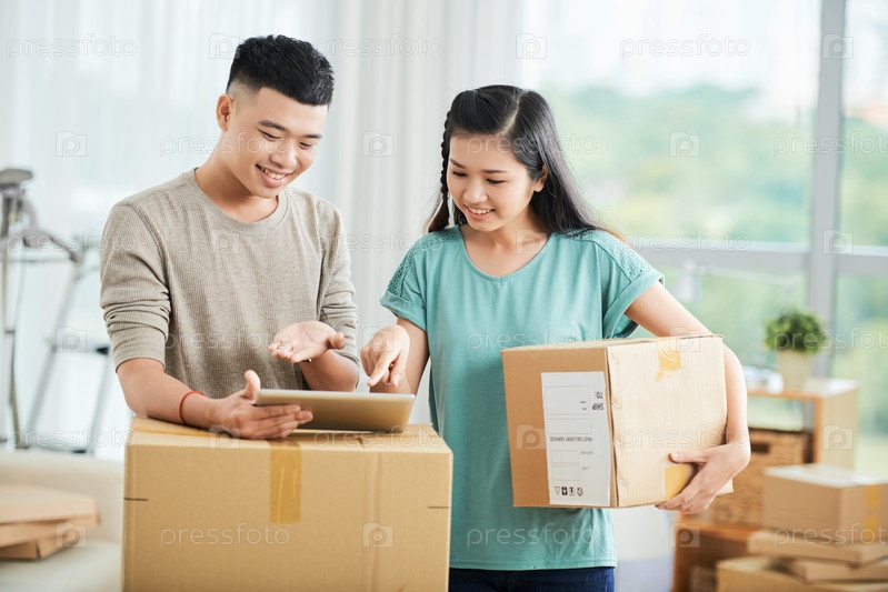 Веселая пара с планшетом в новом доме