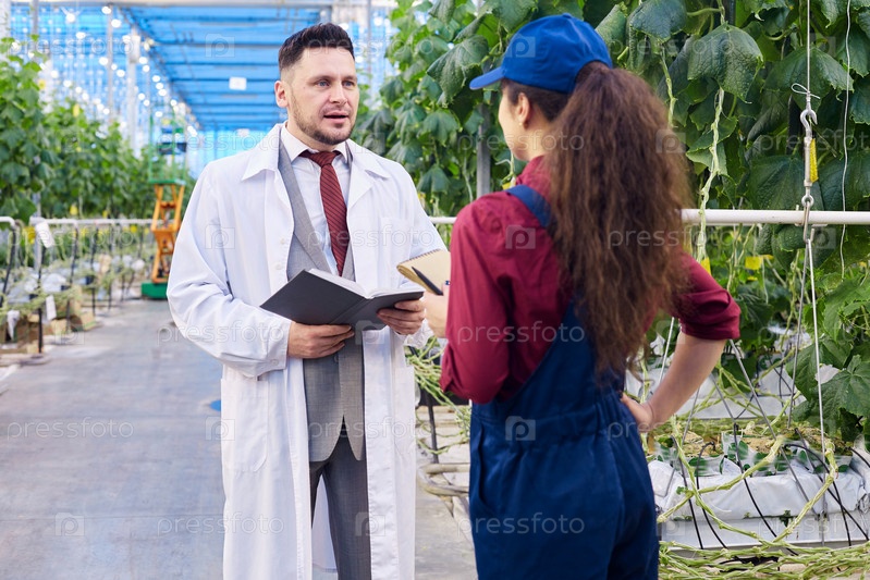 Красивый ученый разговаривает с женщиной-работницей