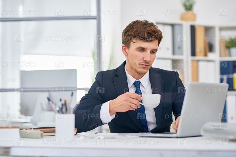 Бизнесмен пьет кофе за столом в офисе