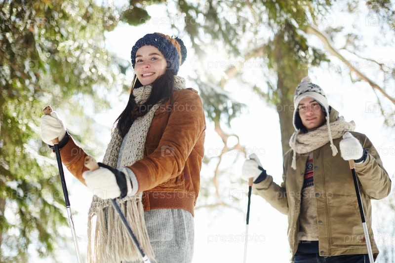 Молодая пара катается на лыжах под солнцем