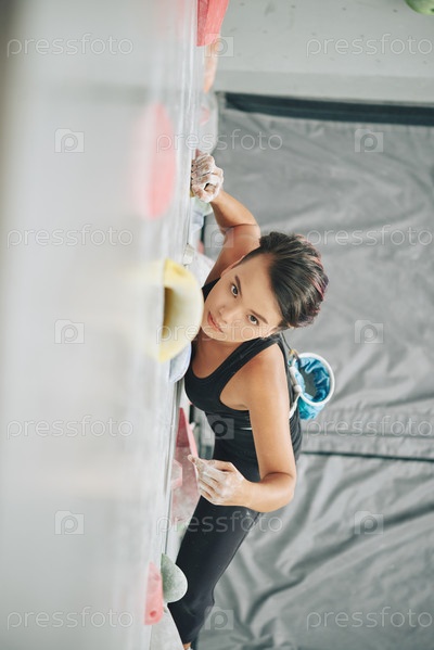 Концентрированная спортсменка, взбирающаяся по стене