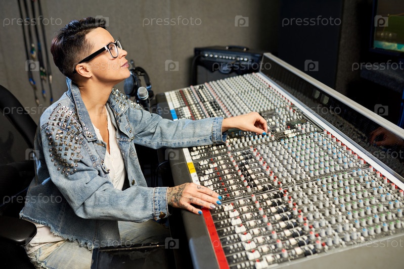 Модная женщина, работающая с музыкальной консолью