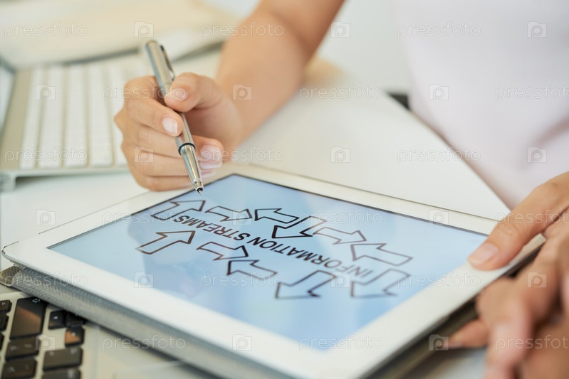 Женщина-посадка держит планшет с графическим изображением