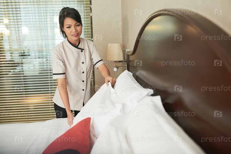 Этническая горничная, готовящая кровать в гостиничном номере