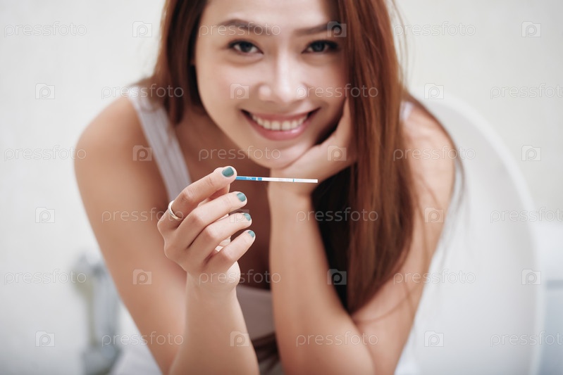 Веселая женщина с положительным тестом на беременность