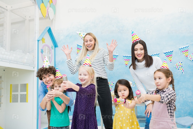 Взволнованные матери развлекаются с детьми на день рождения