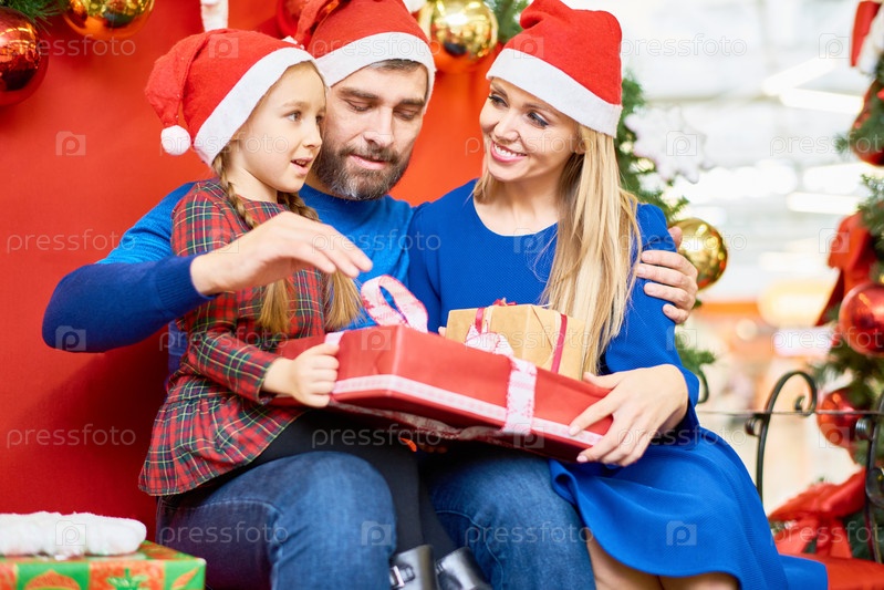Любящая семья с рождественскими подарками в торговом центре