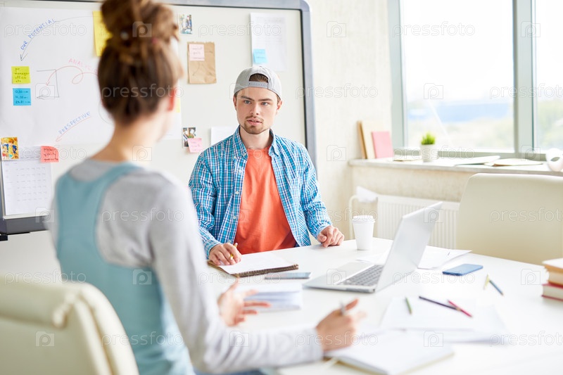 Красивый парень обсуждает университетский проект со своим товарищем по группе