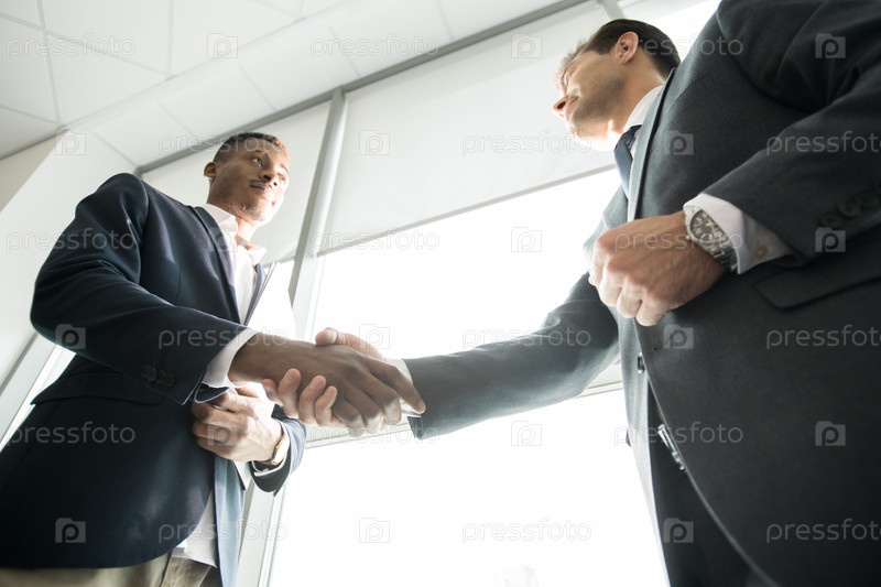 Purposeful African investor making handshake with business compa Целесообразный африканский инвестор делает рукопожатие с компанией по бизнесу