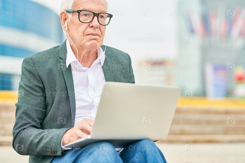 Пожилой предприниматель слушает музыку и использует ноутбук