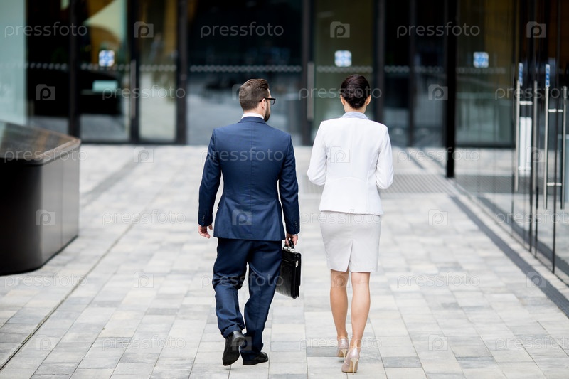 Формальный мужчина и женщина, идущие в офисное здание