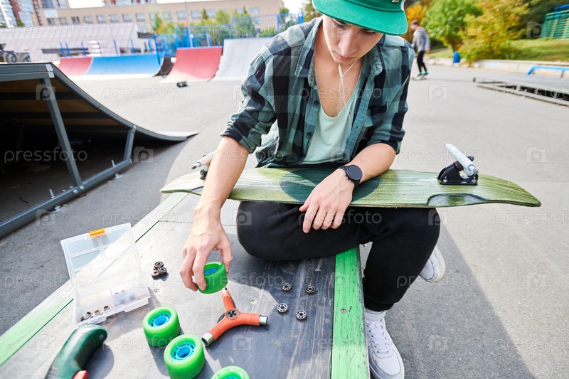 Молодой человек, ремонтирующий скейтборд