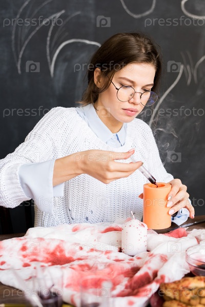 Концентрированная девушка, работающая над украшением Хэллоуина