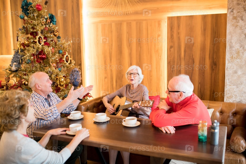 Пожилая леди играет на гитаре на рождественской вечеринке
