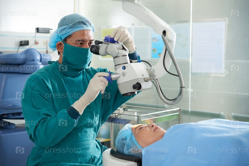 Мужчина, использующий операционный микроскоп во время работы с пациентом