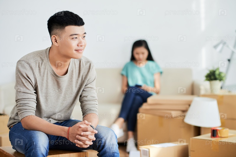 Азиатский мужчина отдыхает во время переезда