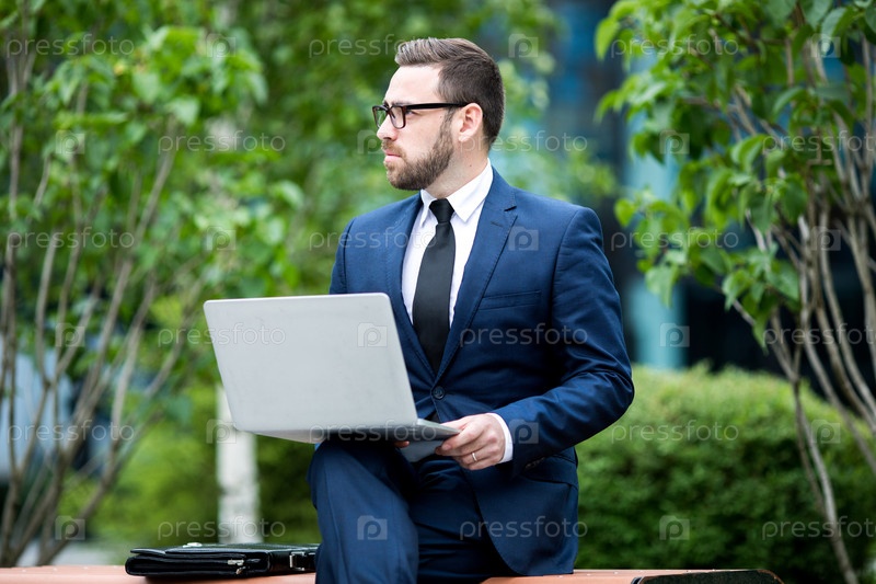 Мужчина сидит на скамейке и держит ноутбук